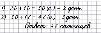 В первый день посадили 20 саженцев, во второй – на 10 саженцев больше, чем в первый, а в третий – на 18 саженцев больше, чем во второй. Сколько саженцев посадили в третий день?