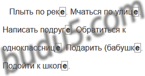 Плыть по (река). Мчаться по (улица). Написать (подруга). Обратиться к (одноклассница). Подарить (бабушка). Подойти к (школа).