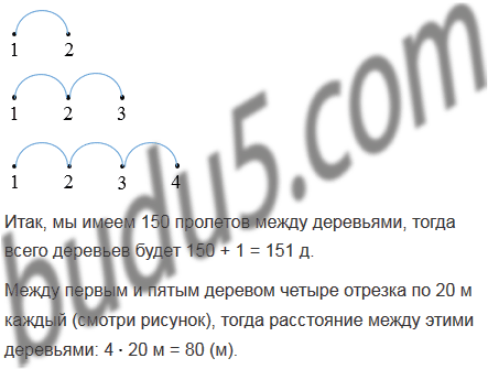 Для озеленения улицы длиной 3 км на одной из ее сторон посадили деревья на расстоянии 20 м друг от друга. Сколько деревьев было посажено? Чему равно расстояние между первым и пятым деревьями?