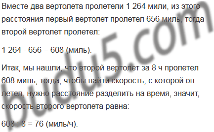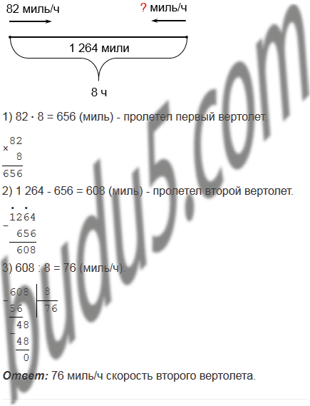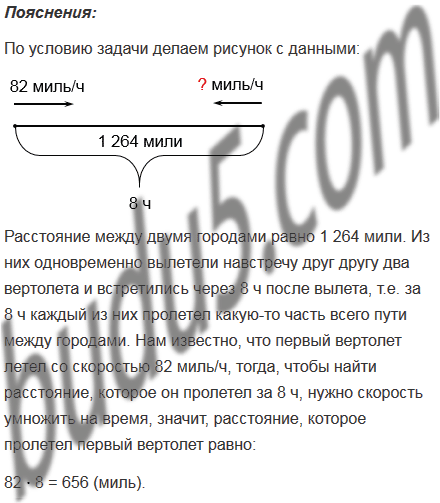 Расстояние между двумя городами равно 1 264 мили (1 сухопутная миля = 1 609 м). Из них одновременно вылетели навстречу друг другу два вертолета и встретились через 8 ч после вылета. Скорость одного из вертолетов 82 миль/ч. С какой скоростью летел второй вертолет?