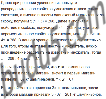 В два магазина завезли 268 кг шампиньонов, причем в первый магазин завезли шампиньонов в 3 раза меньше, чем во второй. Сколько килограммов шампиньонов завезли в каждый магазин?