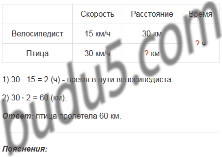 Расстояние между городами А и В равно 30 км. Из города А в город В выехал велосипедист и двигался со скоростью 15 км/ч. Одновременно из города В в направлении города А вылетела птица со скоростью 30 км/ч. Встретившись с велосипедистом, птица развернулась и полетела назад. Прилетев в город В, она снова развернулась и полетела навстречу велосипедисту. Встретившись с ним, птица развернулась и полетела назад в город В и т.д. Сколько километров пролетела птица за то время, пока велосипедист ехал из города А в город В?