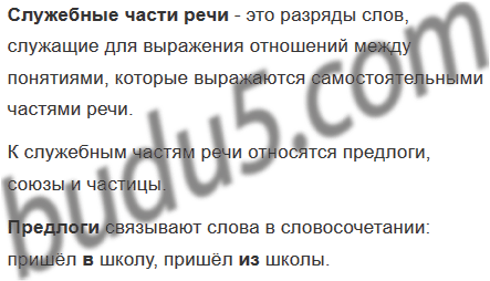 Используя данную схему и материалы учебника, расскажите о служебных частях речи. Приведите примеры.