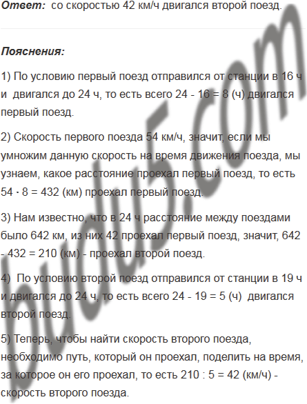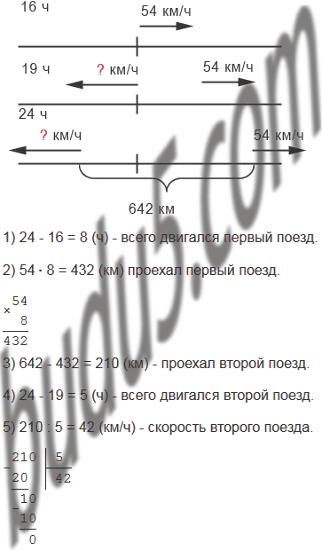 Поезд отправился со станции в 16 ч со скоростью 54 км/ч. В 19 ч с этой же станции в противоположном направлении отправился второй поезд. В 24 ч расстояние между ними было равно 642 км. С какой скоростью двигался второй поезд?