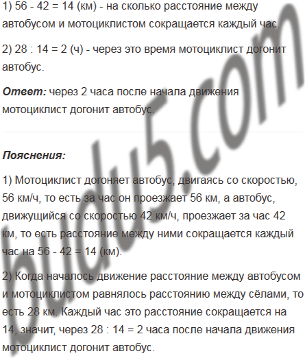 Расстояние между двумя сёлами равно 28 км. Из этих сёл одновременно в одном направлении выехали мотоциклист и автобус. Автобус ехал впереди со скоростью 42 км/ч, а мотоциклист ехал со скоростью 56 км/ч. Через сколько часов после начала движения мотоциклист догонит автобус?