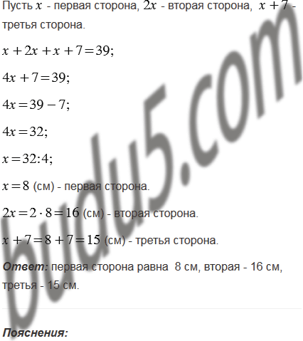 Одна из сторон треугольника в 2 раза меньше второй и на 7 см меньше третьей. Найдите стороны треугольника, если его периметр равен 39 см.
