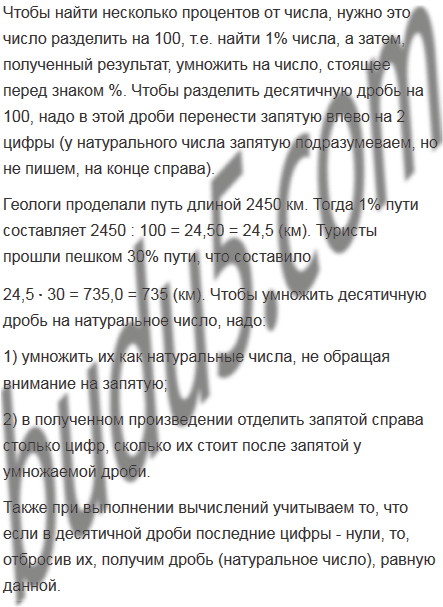 Геологи проделали путь длиной 2450 км. 10% пути они пролетели на самолете, 60% пути проплыли в лодках, а остальную часть прошли пешком. Сколько километров геологи прошли пешком?