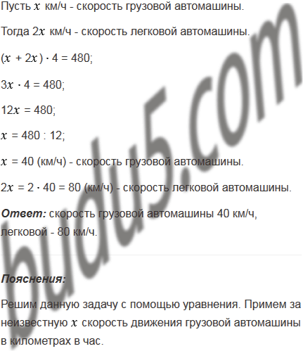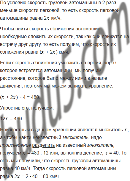 Из двух пунктов одновременно навстречу друг другу вышли грузовая и легковая машины. Скорость грузовой автомашины в 2 раза меньше скорости легковой. Найдите скорость каждой автомашины, если известно, что расстояние между пунктами 480 км и машины встретились через 4 ч.