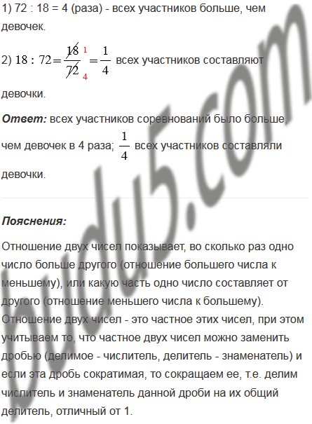 В спортивных соревнованиях участвовали 72 школьника, среди которых было 18 девочек. Во сколько раз всех участников соревнований было больше, чем девочек? Какую часть всех участников составляли девочки?