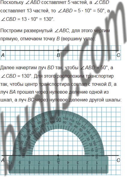 Начертите развёрнутый угол АВС и проведите луч BD так, чтобы градусные меры углов ABD и CBD относились как 5 : 13.