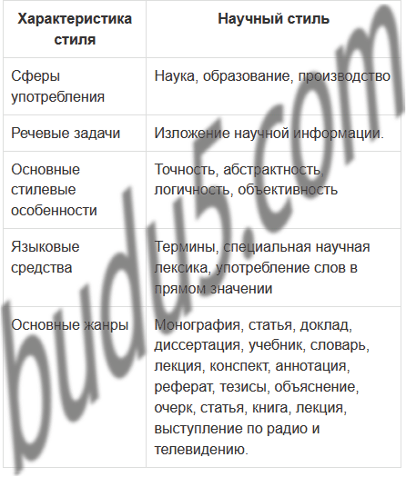 Используя информацию параграфа, составьте таблицу «Научный стиль», в которую включите графы: «Сферы употребления», «Речевые задачи», «Основные стилевые особенности», «Языковые средства», «Основные жанры».