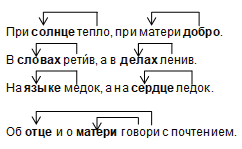 тепло (при чём?) при солнце, добро (при ком?) при матери, ретив (в чём?) в словах, ленив (в чём?) в делах, медок (на чём?) на языке, ледок (на чём?) на сердце, говори (о ком?) об отце, говори (о ком?) о матери