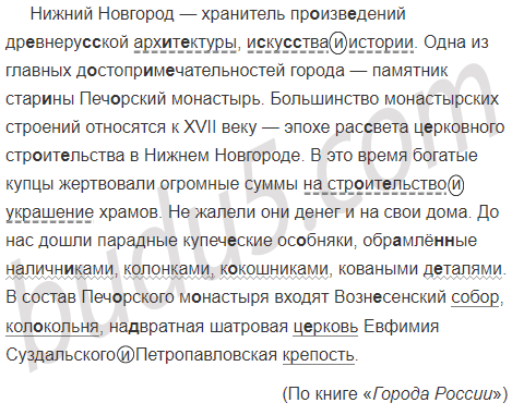 Нижний Новгород — хранитель пр..изв..дений др..внеру(с, сс)кой арх..т..ктуры, и..ку(с, сс)тва и истории. Одна из главных д..стопр..м..чательностей города — памятник стар..ны Печ..рский монастырь. Большинство монастырских строений относятся к XVII веку — эпохе рас..вета ц..рковного стр..ит..льства в Нижнем Новгороде. В это время богатые купцы жертвовали огромные суммы на стр..ит..льство и украшение храмов. Не жалели они денег и на свои дома. До нас дошли парадные купеч..ские ос..бняки, обр..млё(н, нн)ые наличн..ками, колонками, к..кошниками, коваными д..талями. В состав Печ..рского м..настыря входят Возн..сенский собор, кол..кольня, на..вратная шатровая ц..рковь Евфимия Суздальского и Петропавловская крепость.