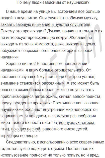 Современный город состоит из тысяч людей, высоких зданий и постоянного шума. Порой кажется, что это не машины, а время, со свистом несущееся мимо нас. Звуки окружающего городского мира мало кому нравятся. И тогда человек включает любимую радиостанцию или песню в плеере. Гармония звуков музыкальных инструментов, голос солиста, определённый ритм покоряют наш слух, и мы уже не можем без них. Тишина, звук ветра, прибой, дождь по крыше - это тоже музыка. Почему всё больше людей становятся зависимы от наушников? (Но Е. Гатаулиной)