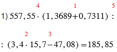 1) 557,55 • (1,3689 + 0,7311) : (3,4 • 15,7 - 47,08);